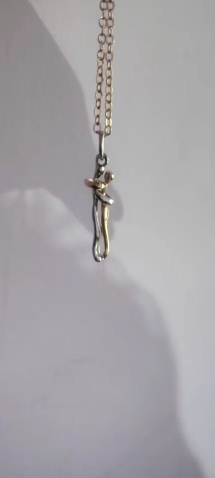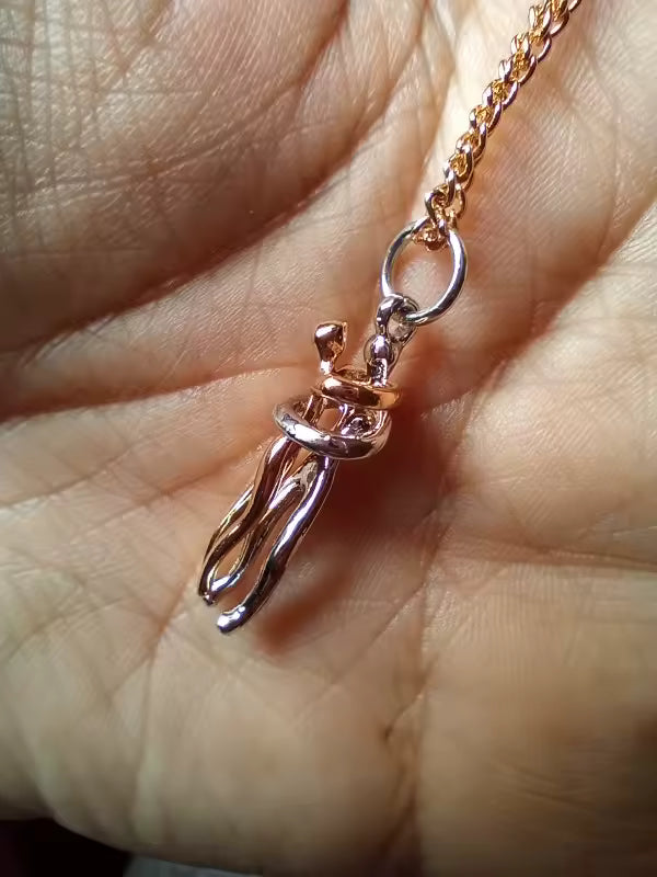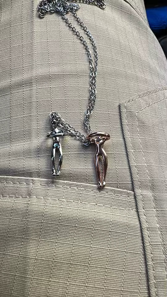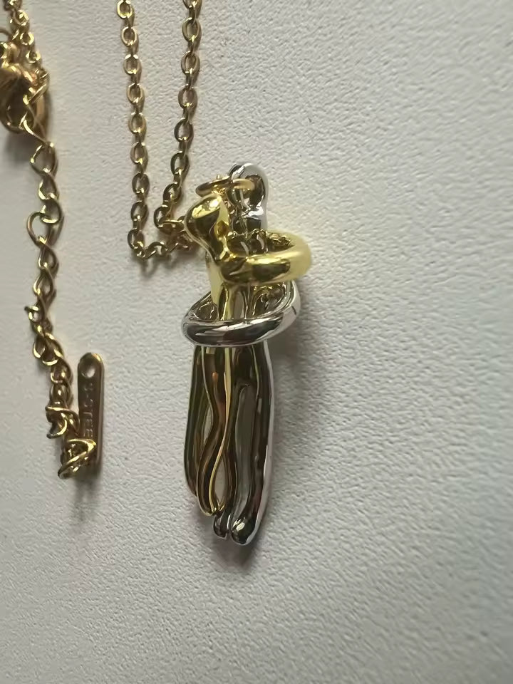 Ce collier a été imaginé pour représenter l’intimité entre deux êtres qui s’aiment. Deux silhouettes, deux chemins, un seul lien.